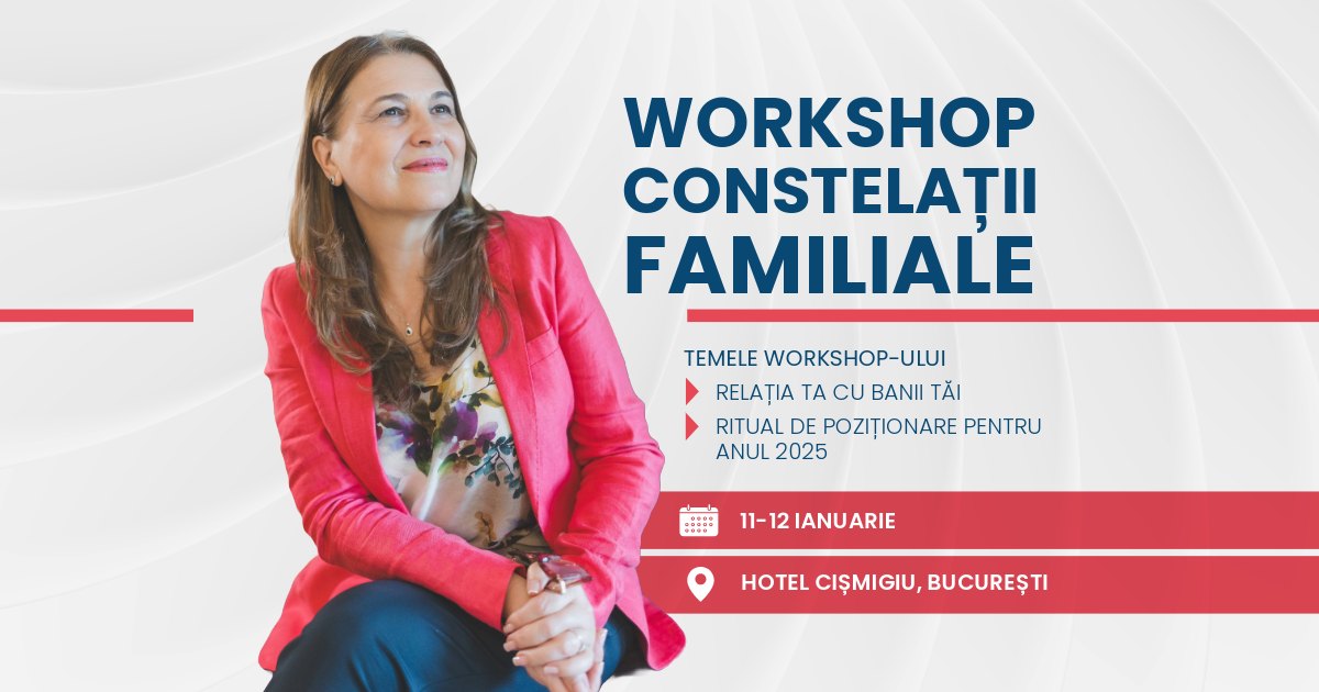 Constanta, 19-20 OCTOMBRIE 2024 - WORKSHOP Constelatii Familiale cu Laura Ghita Modalitatea Constelațiilor Familiale te poate ajuta să faci această muncă interioară importantă și mișcarea potrivita pentru a depăși problemele actuale și pentru a-ți transforma viața! Un atelier de Constelatii Familiale poate fi descris ca o experienta profundă, meditativă deoarece, în conexiune cu o altă […]